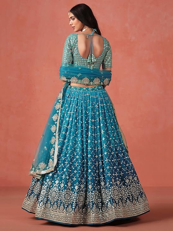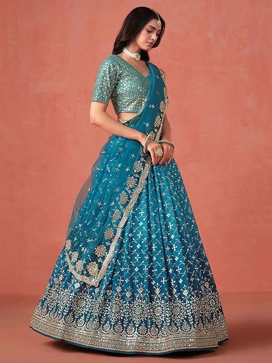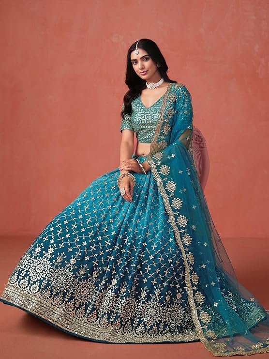 - Lehenga Work: Sequins Zari Embroidered; Blouse Work: Sequins Zari Embroidered; Dupatta Work: Sequins Zari Embroidered
